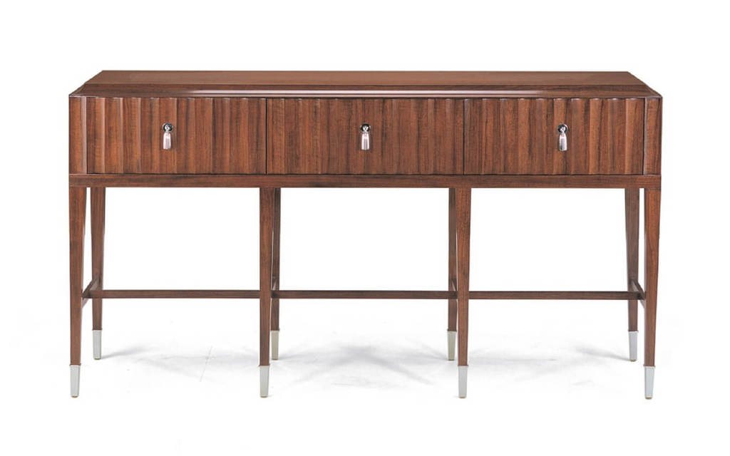 Console with fluted front. Figured walnut veneer. Stainless sabot feet.