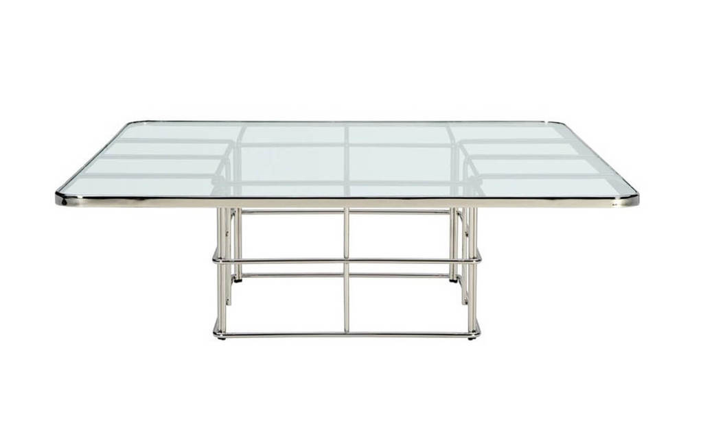 Square cocktail table with polished stainless steel frame and clear low iron glass top.