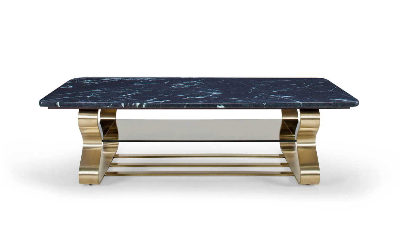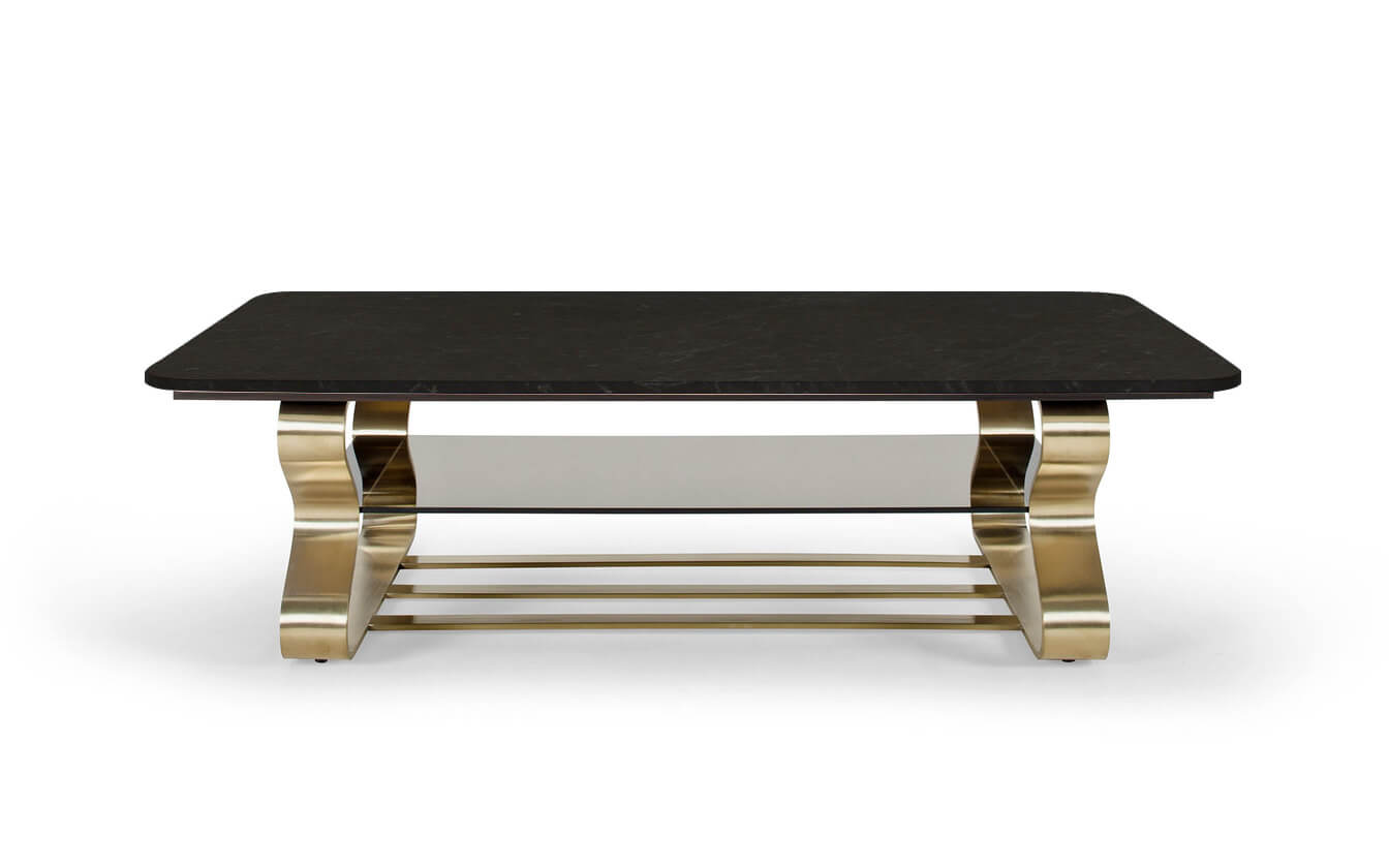Coffee table with undulating metal base in Bristol Brass finish. Bronze glass shelf.