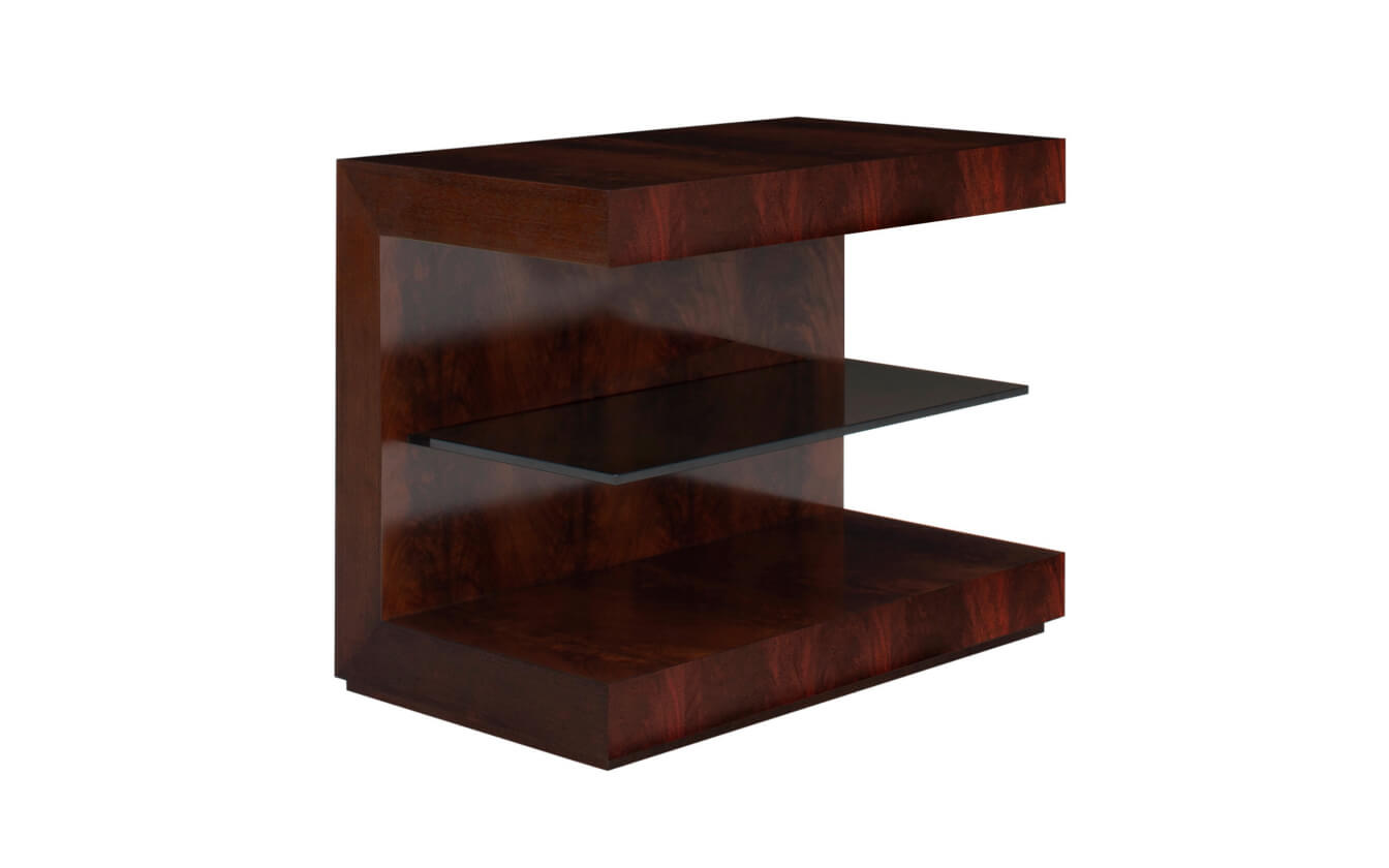 Crotch walnut veneer top. Smoked glass shelf.