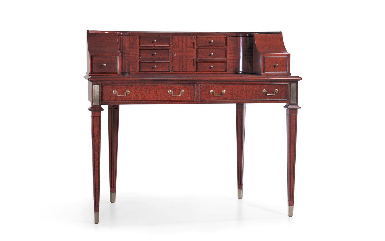 Asia Cherry wood and veneer, with wood gallery and brass end caps. COL upholstered top.
