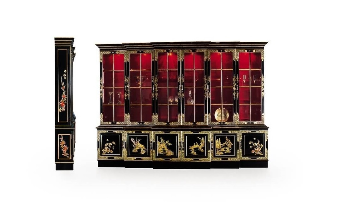 Asia Cherry wood and veneer. Black & red lacquer. Clear tempered glass door front.