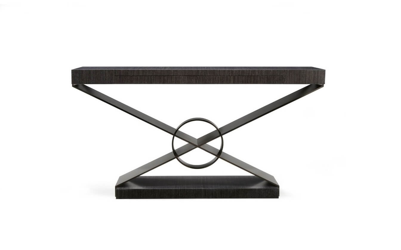 Console in EV gray oak or mocha ebony. Gun metal powder coat.