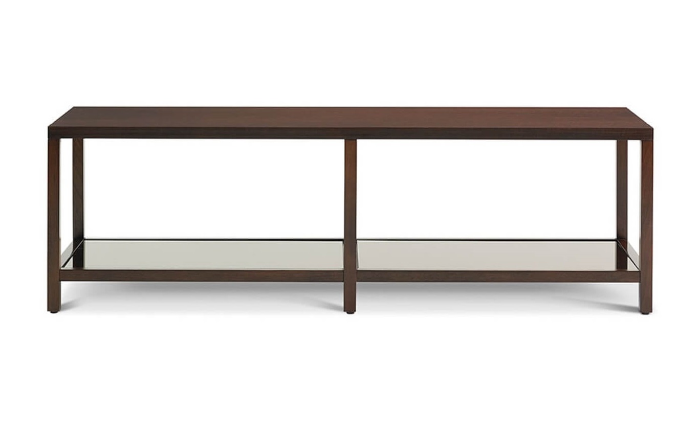 Coffee table in walnut veneer. Bronze mirror insets on bottom shelf.