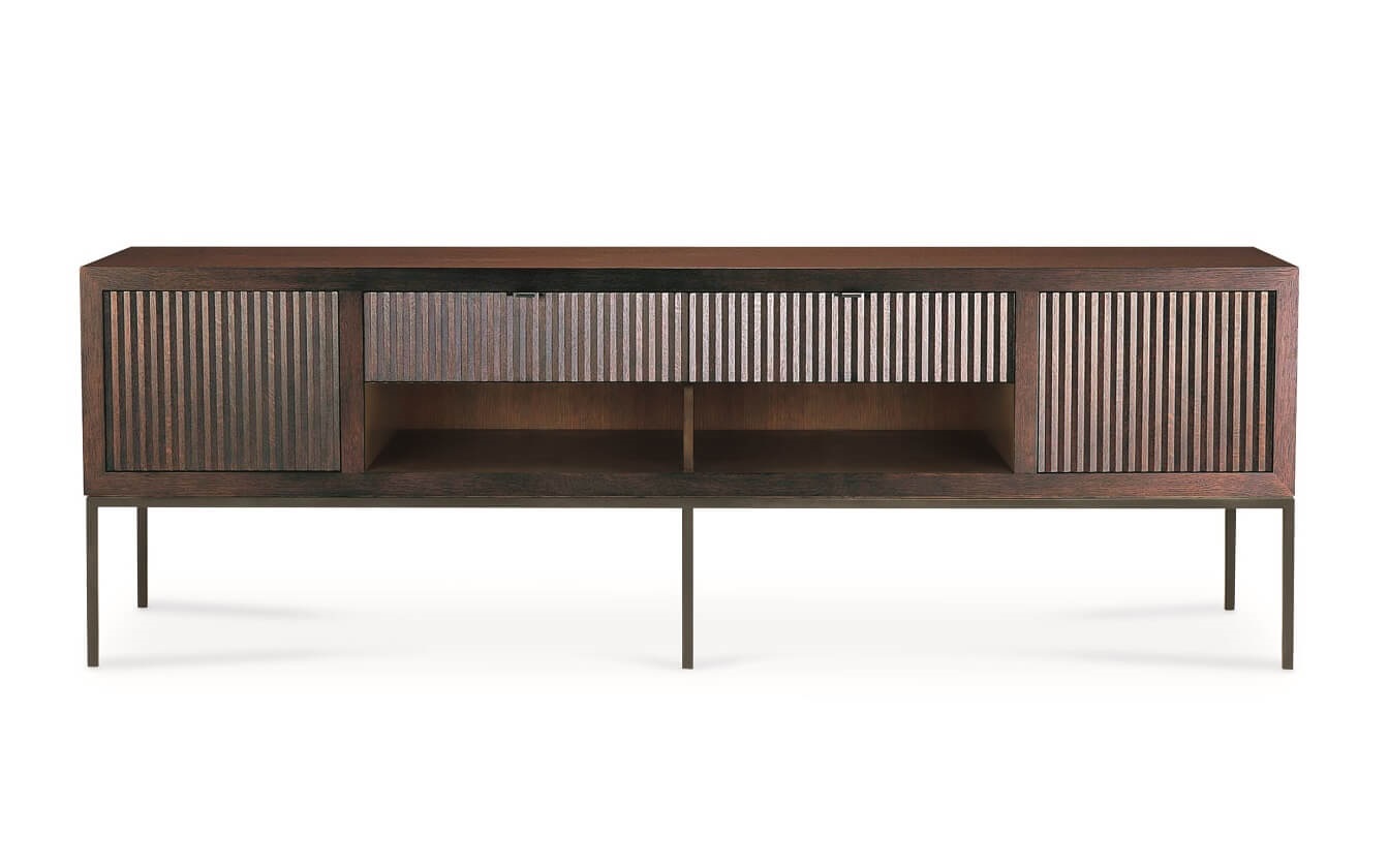 Grey cerused oak case with saw-tooth door and drawer fronts. Charcoal powder coat base.