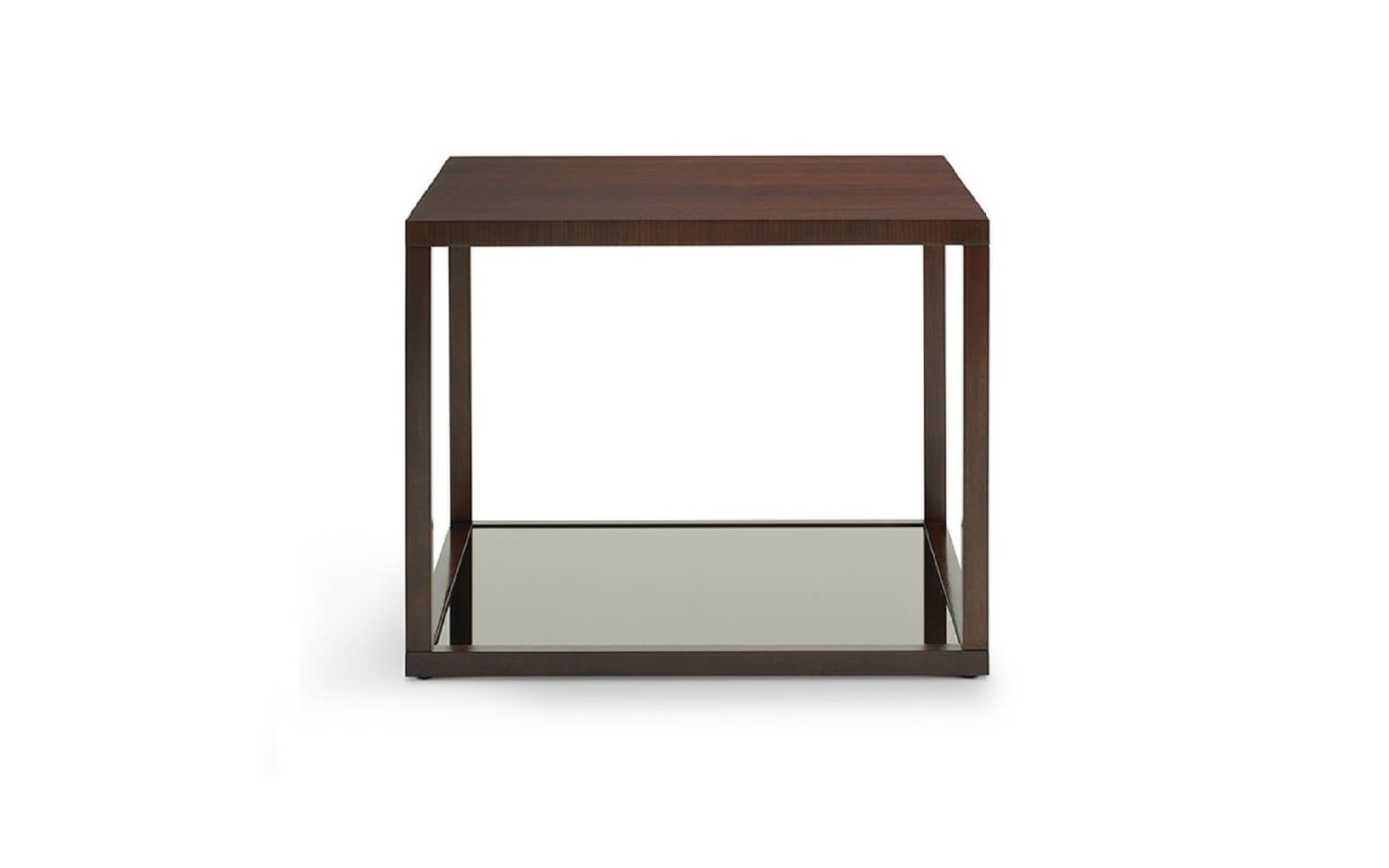 Square side table in walnut veneer. Bronze mirror insets on bottom shelf.