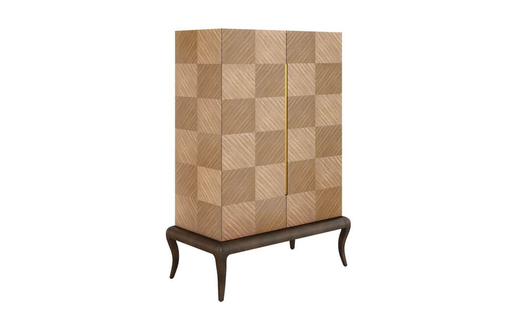 Checkered beige wenge light wood finish. Wood base in dark metal lacquer finish. Brushed brass gold roll finish accent. Three adjustable shelves.
