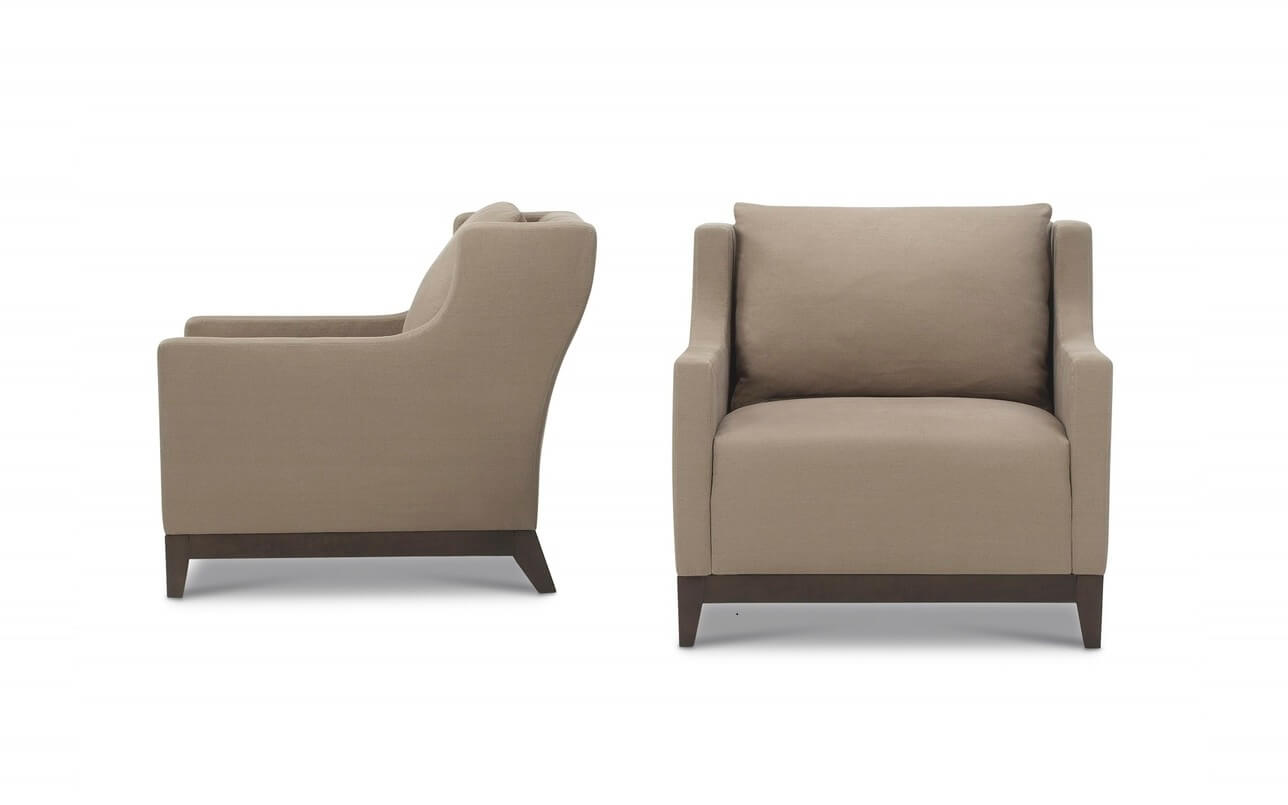 Fully upholstered chair. Dark brown solid Asia Cherry wood frame.