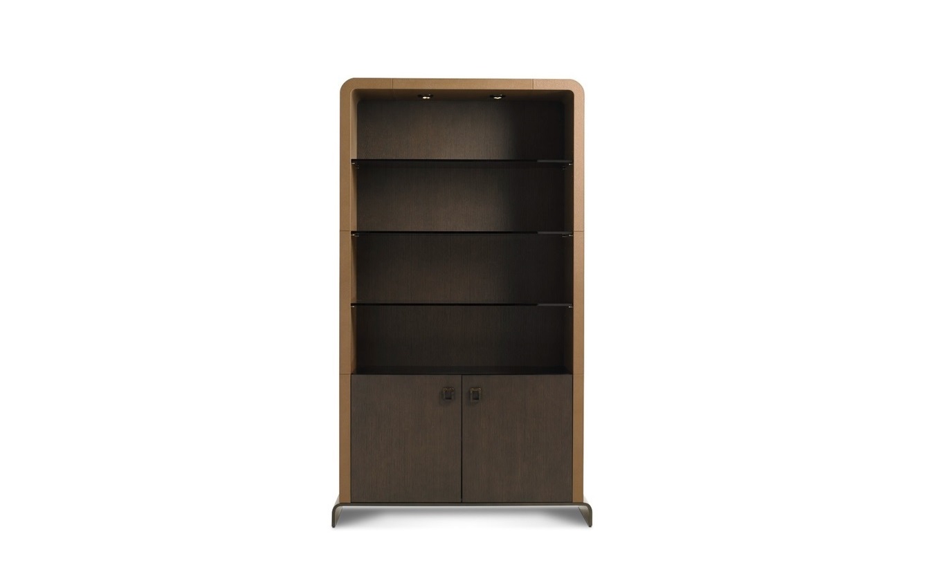Rift cut oak veneer with leather wrap exterior and bronze base.