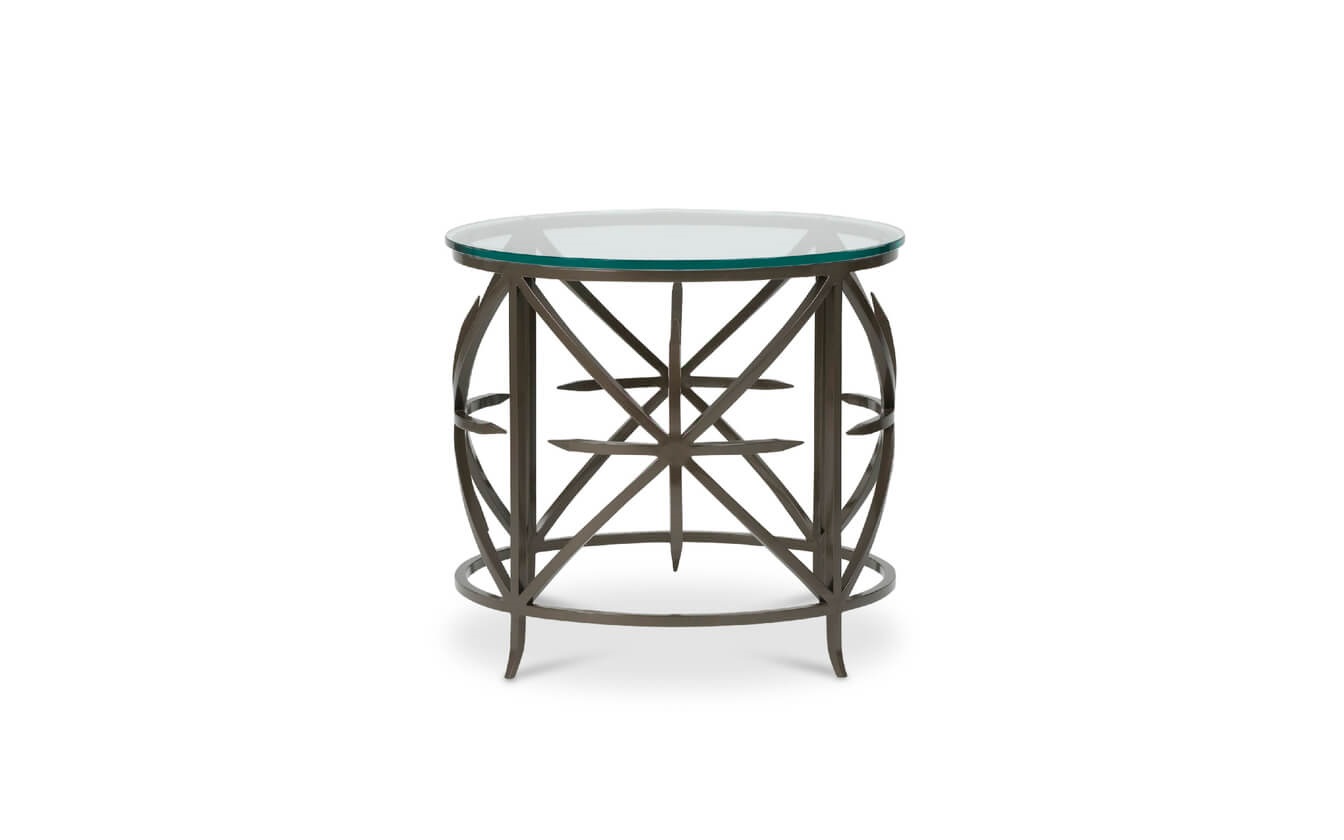 Side table with clear temper glass top. Metal base in burnished bronze or white powder coat.