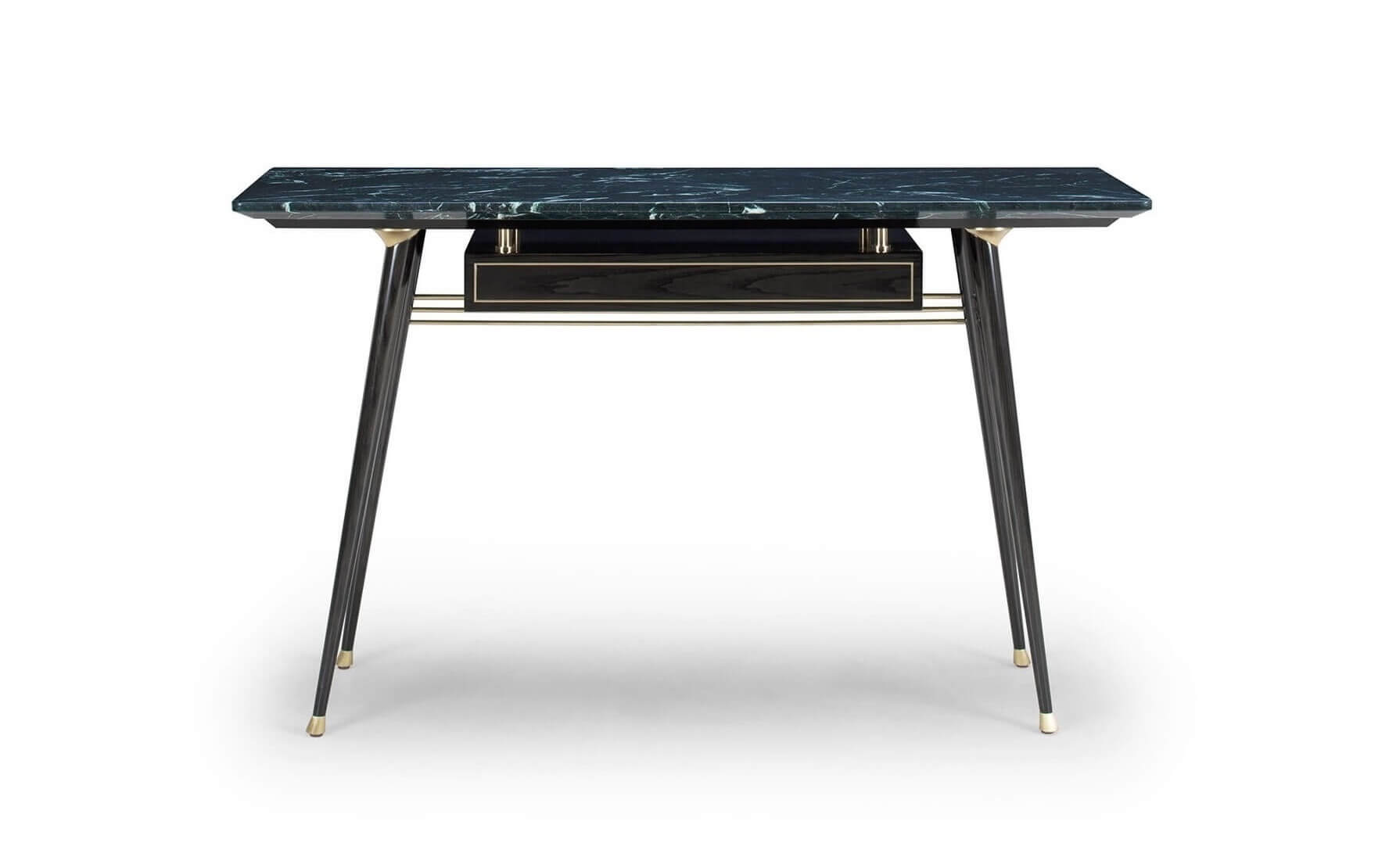 Console with drawer. Wood legs with metal sleeve in brass finish.